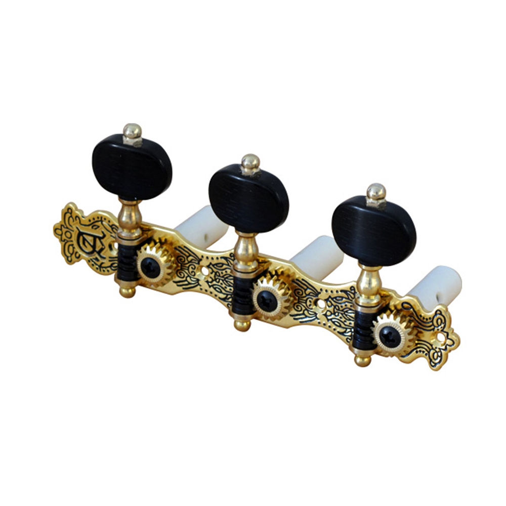 Clavijero para guitarra de seis cuerdas, con acabado en oro viejo y adorno de lira. Está montado con cojinetes remachados y paleta hecha a mano. Un clavijero de mucha precisión y diseño exclusivo Alhambra.