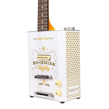 Basada en una lata de 2 galones de miel de abejas con estructura interna de madera. Modelo: Honey Cuerpo: Lata hueca de metal reciclado con panel trasero desmontable. Esqueleto interno de madera para incrementar la amplificación y asegurar la integridad estructural. Mástil: Arce Tipo de mástil: Bohemian Through-Body Diapasón: Palosanto Pala: Golden Honey Acabado: Dark Honey Trastes: 21 Anchura de cejuela: 1 3/4 Anchura en el 12º traste: 2 1/8 Anchura en el 21º traste: 2 3/8 Grosor de mástil: 7/8 Escala: 24 3/4 Hardware: Cromado Clavijeros: Cromados Puente/Cordal: Tune-o-Matic Pastillas: 1 x Single Coil Controles: 1 x Volumen, 1 x Tono Soportes: Este modelo dispone de cuatro pivotes de goma reciclada para un apoyo estable en el suelo.