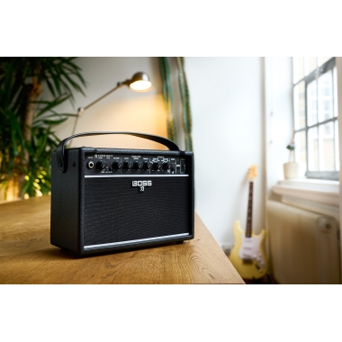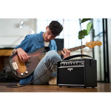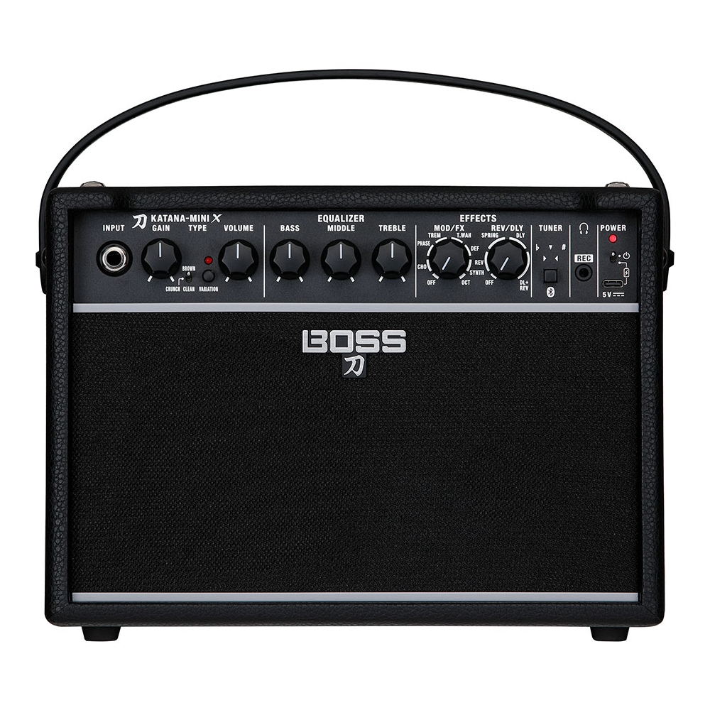 Katana-Mini X también ofrece muchas mejoras para dinamizar tus sesiones de interpretación, como un afinador integrado, controles en el panel frontal, una batería interna recargable y Bluetooth® integrado para transmitir música desde tu smartphone.