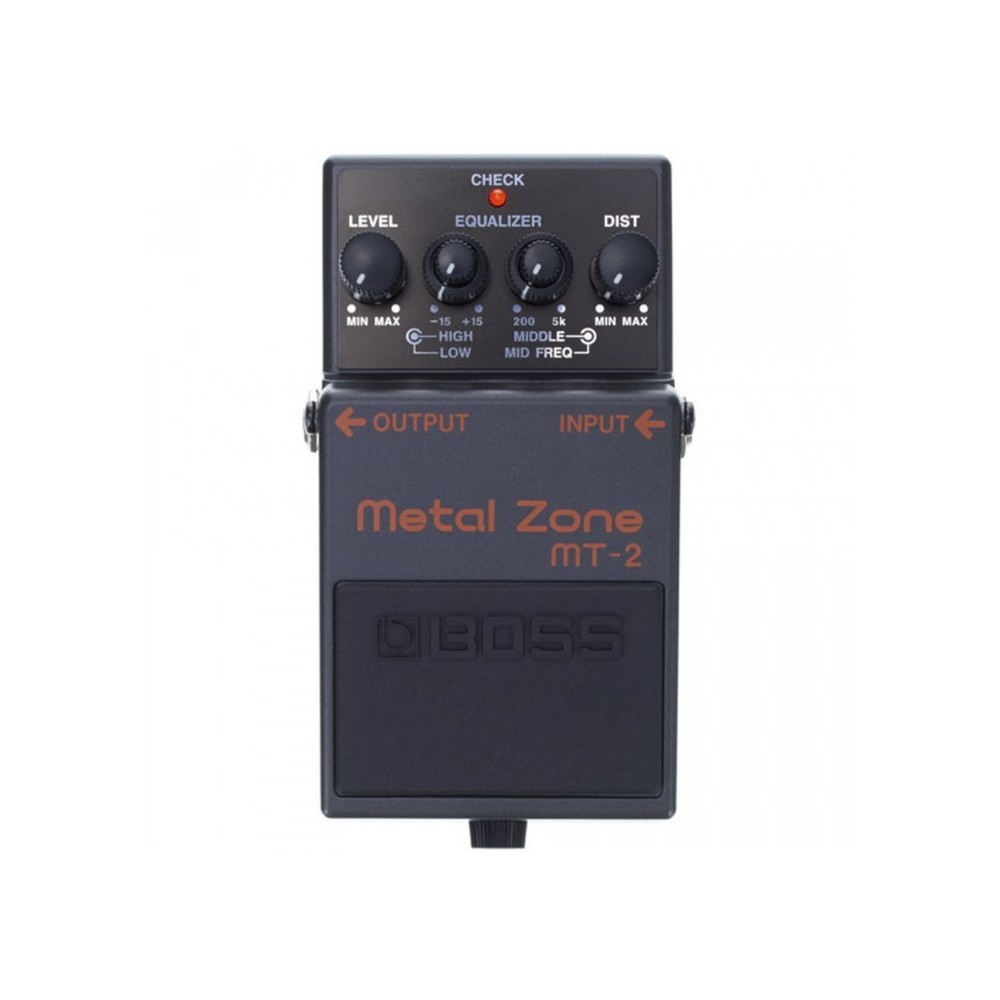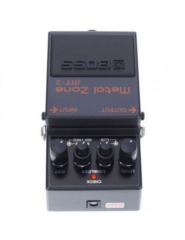 El MT-2 es el pedal más popular de BOSS. Los circuitos de gain dual crean una distorsión gruesa, tube stack con medios y bajos fuertes y con un sustain infinito. EQ de 3 bandas con medios semiparamétricos para llevar el sonido al limite.