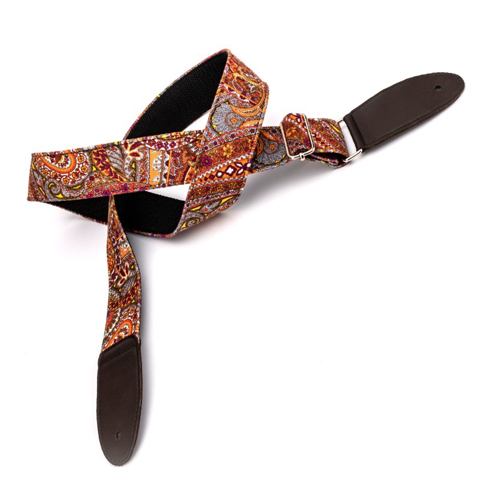 Preciosa correa textil manufacturada a mano de la serie VELVET de Bourbon Strap Guitar. Basada en tonalidades tierra con bonitos elementos decorativos que se ajusta a todo tipo de instrumentos musicales.