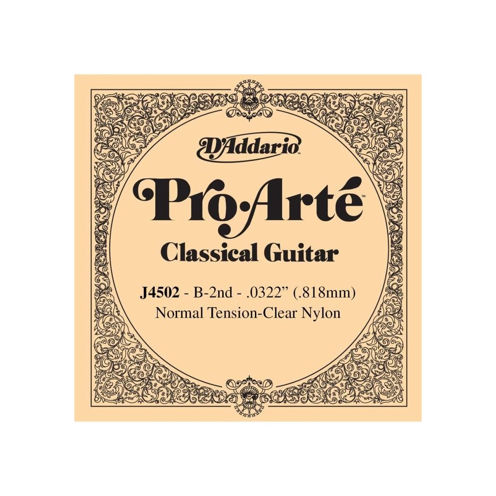 Cuerda Guitarra Clásica Daddario J4502 2ª. Cuerdas sueltas Guitarra Española Serie Pro Arte B-2 (Si) Nylon Tensión Media. Las cuerdas Pro-Arte son nuestro líder de ventas en todo el mundo y las mejores cuerdas D Addario para guitarra española. Todas las cuerdas Pro-Arte son clasificadas por una máquina láser muy sofisticada controlada por ordenador que realiza medidas de diámetro/tensión y control de calidad, asegurando un gran sonido y unos agudos precisos en cada juego. Las cuerdas graves Pro-Arte son entorchadas usando un cobre chapado en plata sobre un núcleo multi-filamentado de nylon para obtener un tono cálido y con mayor proyección. Características: Cuerda para guitarra clásica Tensión media Calibre: 032 Grosor: .82mm Pro-Arté Nylon Core Nylon plano clasificado por una máquina láser 2ª Si/B