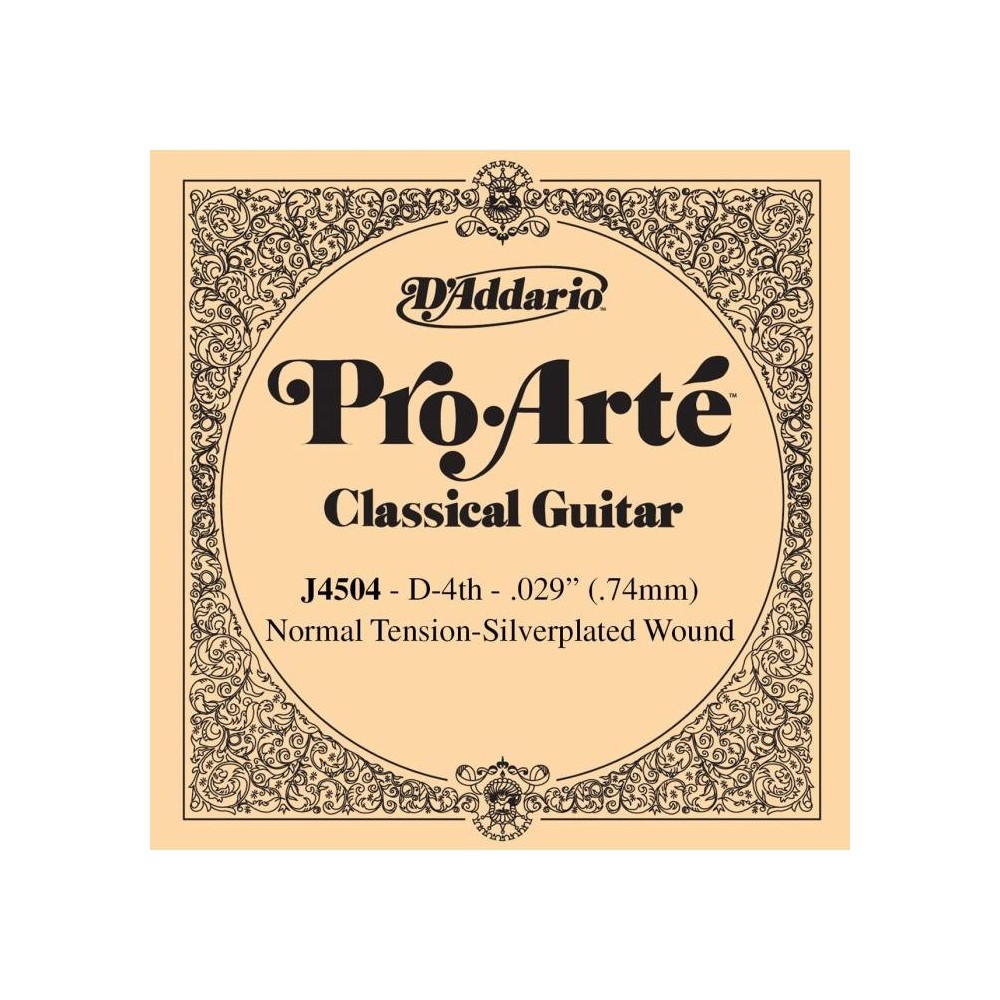 Cuerda Guitarra Clásica Daddario J4504 4ª. Cuerdas sueltas Guitarra Española Serie Pro Arte D-4 (Re) Entorchada Tensión Media. Las cuerdas Pro-Arte son nuestro líder de ventas en todo el mundo y las mejores cuerdas D Addario para guitarra española. Todas las cuerdas Pro-Arte son clasificadas por una máquina láser muy sofisticada controlada por ordenador que realiza medidas de diámetro/tensión y control de calidad, asegurando un gran sonido y unos agudos precisos en cada juego. Las cuerdas graves Pro-Arte son entorchadas usando un cobre chapado en plata sobre un núcleo multi-filamentado de nylon para obtener un tono cálido y con mayor proyección. Características: Cuerda para guitarra clásica Tensión media Entorchado redondo Calibre: 029 Grosor: .74mm Pro-Arté Nylon Core Entorchadas de cobre chapado en plata Multifilamentado de nylon 4ª Re/D