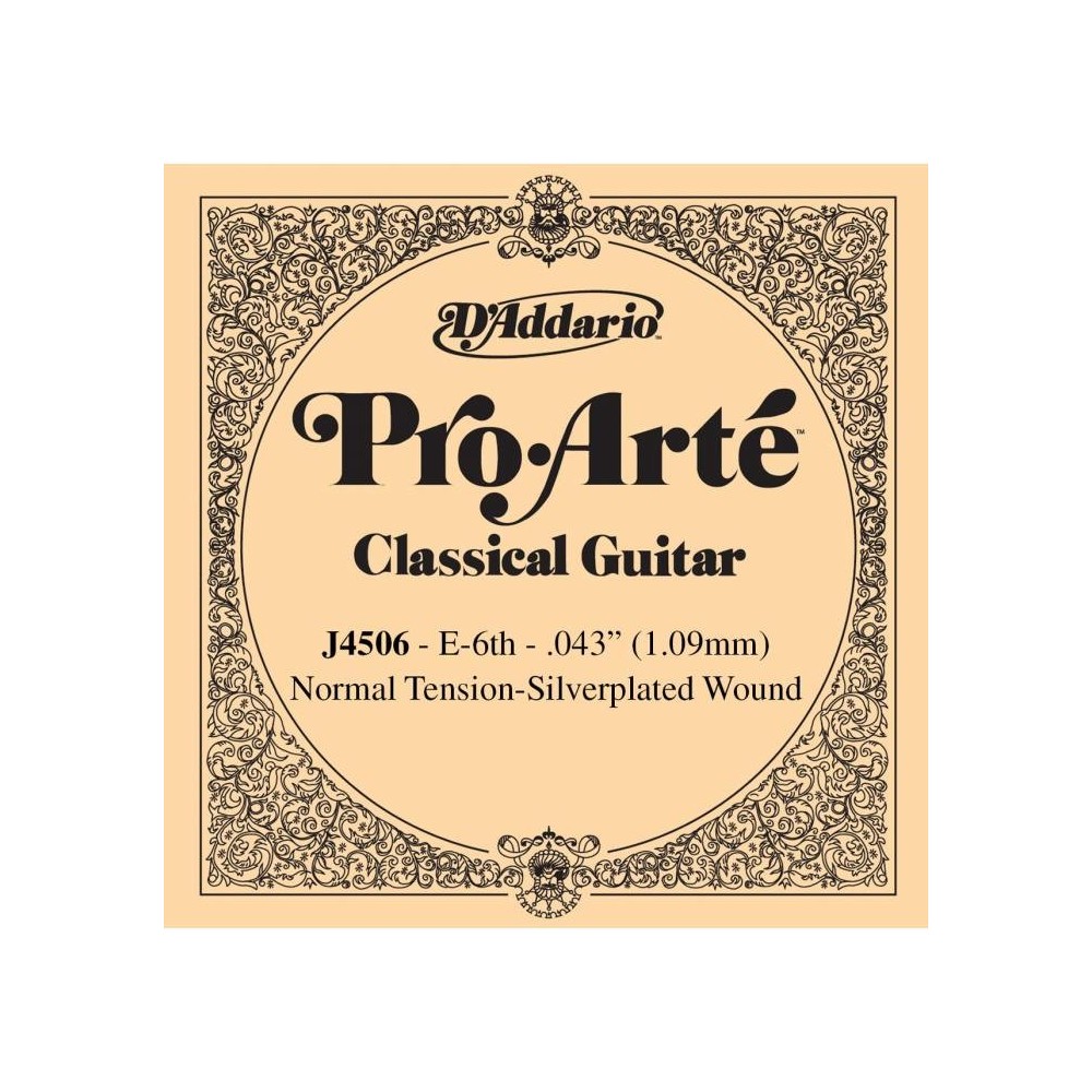 Cuerda Guitarra Clásica Daddario J4506 6ª. Cuerdas sueltas Guitarra Española Serie Pro Arte E-6 (Mi) Entorchado Tensión Media. Las cuerdas Pro-Arte son nuestro líder de ventas en todo el mundo y las mejores cuerdas D Addario para guitarra española. Todas las cuerdas Pro-Arte son clasificadas por una máquina láser muy sofisticada controlada por ordenador que realiza medidas de diámetro/tensión y control de calidad, asegurando un gran sonido y unos agudos precisos en cada juego. Las cuerdas graves Pro-Arte son entorchadas usando un cobre chapado en plata sobre un núcleo multi-filamentado de nylon para obtener un tono cálido y con mayor proyección. Características: Cuerda para guitarra clásica Tensión media Entorchado redondo Calibre: 043 Grosor: 1.09mm Pro-Arté Nylon Core Entorchadas de cobre chapado en plata Multifilamentado de nylon 6ª Mi/E