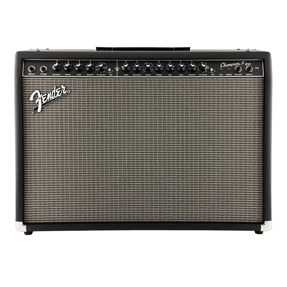 Champion II 100 ofrece tonos limpios y overdrive de Fender mundialmente reconocidos, además de una variedad de sabores de distorsión británica y moderna. Del jazz al country, del blues al metal, es fácil encontrar el sonido adecuado. También hay una selección de efectos incorporada que incluye reverberación, retardo/eco, coro, trémolo, vibratone y más. Los tiempos de retardo y las velocidades del trémolo se pueden configurar fácilmente con el botón TAP para que coincidan con los tempos de las canciones.