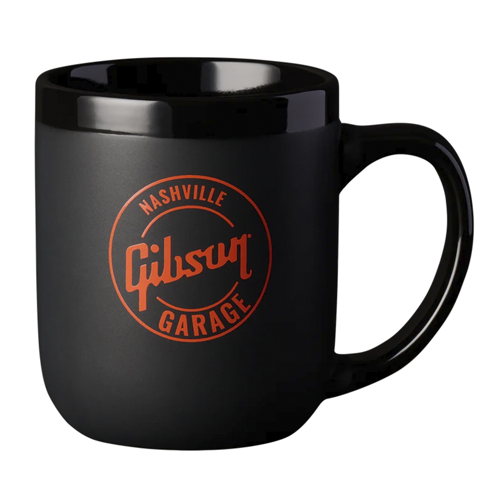 Esta taza de café de cerámica negra de 16 onzas presenta el logotipo de Gibson Garage Nashville en color naranja.