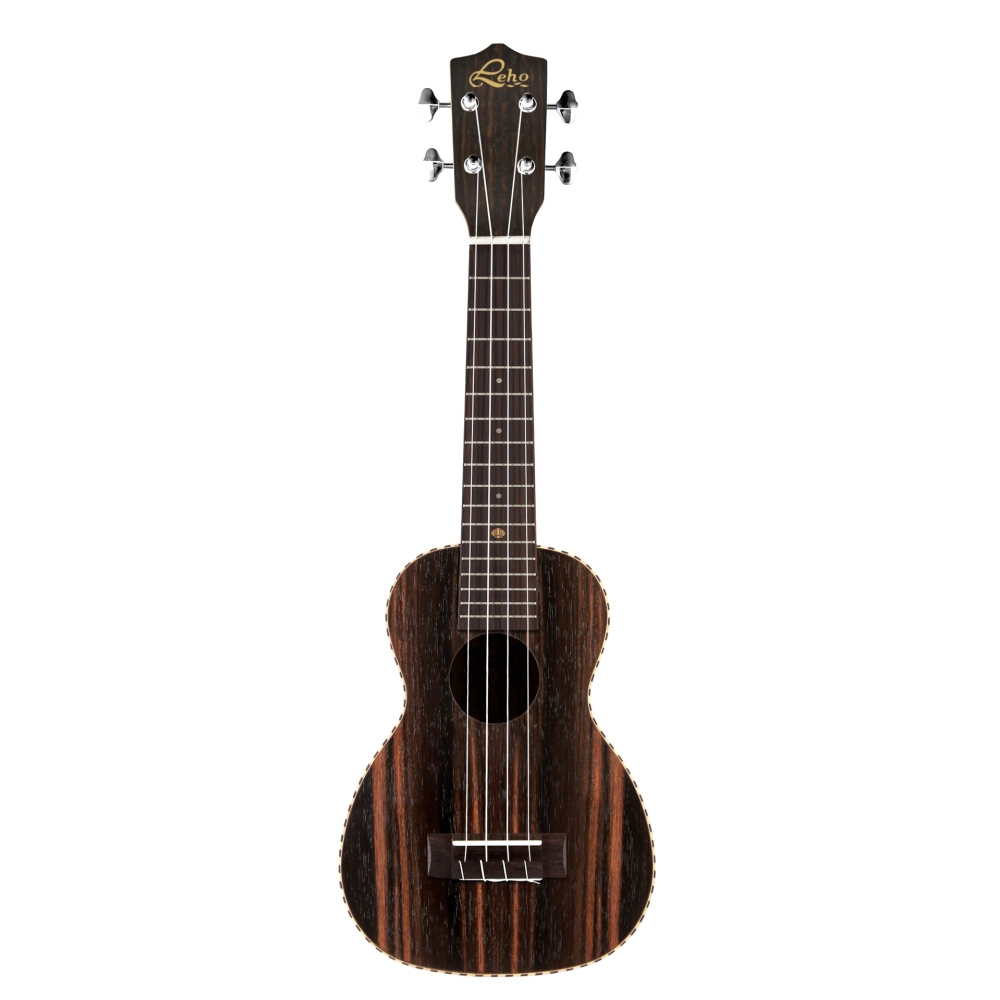 Ukelele LEHO LHUS-ALEB Soprano.Tapa, fondo plano y aros en Ébano laminado. Mástil de Nato. Diapasón de Palosanto laminado. 12 trastes en nickel plateado. Puente de Palosanto macizo. Longitud de escala 350mm. Cejuela ABS. Binding tipo cordel. Clavijeros mecánicos con pastillas negras. Cuerdas Aquila. Incluye funda de protección y transporte