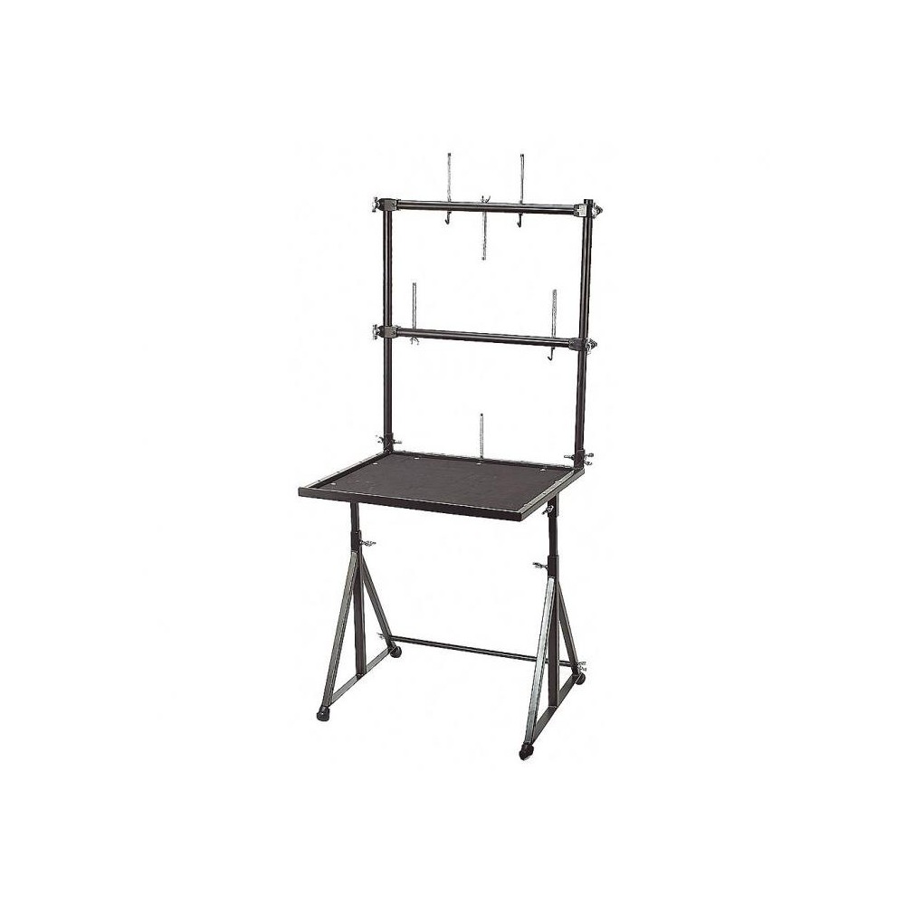 La estación de trabajo ideal para los percusionistas para presentaciones en vivo o el estudio. Esta versátil mesa puede acomodar docenas de instrumentos de percusión a un fácil alcance Mesa de 22 A x 19 P de altura ajustable que puede usarse con todas las variedades de instrumentos de percusión de mano de LP incluyendo panderos, shékeres, claves, shakers, güiros, maracas y muchos otros. La superficie de ejecución con recubrimiento de hule protege los instrumentos y permite un manejo silencioso. La orilla posterior elevada de la mesa evita que los instrumentos se rueden de la mesa. Dos barras transversales sobrepuestas de altura ajustable proveen hasta 24 localizaciones de montaje para usarse con mástiles de montaje de 3/8. Seis mástiles y tres ganchos de triángulo se incluyen con cada mesa, y están disponibles separadamente mástiles adicionales. Colapsable para fácil instalación y portabilidad. Al desarmarse, la unidad mide 26 Ancho x 20 Altura x 3 Profundidad y cabe fácilmente en su bolsa de transporte de nylon.