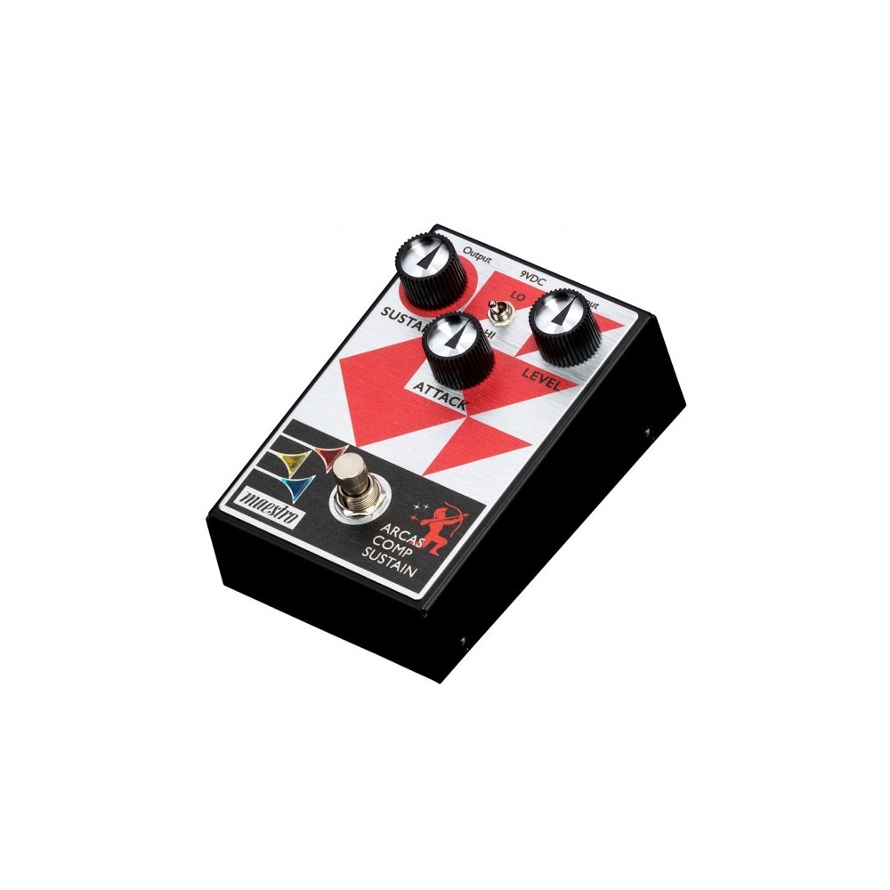 El pedal Maestro Arcas Compressor Sustainer proporciona una excelente versatilidad. Ofrece tanto compresión ligera y transparente como pesada, compresión fuerte. Ofrece suficiente sustain y compensación de nivel para convertirse en un caballo de batalla para cualquier situación. Este pedal completamente analógico Cuenta con un interruptor de palanca de modo de dos posiciones para una mayor versatilidad sónica. El modo LO es menos sensible al ataque de selección, mientras que el modo HI es más sensible al ataque de selección. El intuitivo diseño de control de 3 perillas permite a los usuarios marcar rápidamente el Sustain deseado (cantidad de ganancia aplicada durante compresión), controle el ataque (qué tan rápido se activa la compresión) y ajuste la cantidad de compensación de ganancia y la potencia general del pedal. volumen de salida con el control de nivel. El interruptor de pie de derivación real activa las luces LED en las cornetas en el logotipo de Maestro cuando está encendido, por lo que siempre sabrás cuando el efecto está activo.