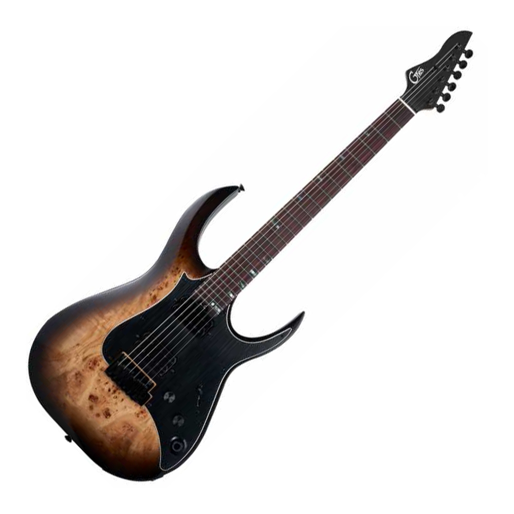 La M810 destaca significativamente en términos de diseño. Cuenta con un mástil de arce flameado tostado de cinco piezas con diapasón de palisandro y acabado satinado, lo que proporciona una estructura mucho más estable y menos maleable, mejorada por su cejuela de hueso y su varilla de ajuste de acero de doble acción. El cuerpo original de aliso ha sido mejorado con una tapa de álamo rizado, resultando en un cuerpo más ligero, una resonancia más equilibrada y una estética más pulida. La combinación de arce, palisandro, aliso y álamo es impresionante, realzada por las pastillas de mástil GTRS HMT-1N y de puente GTRS HMT-1B. Además, la guitarra ofrece una mayor estabilidad de afinación y la practicidad del trémolo, gracias a su puente GTRS PW de 2 puntos, una mejora significativa respecto al puente original de la M800.