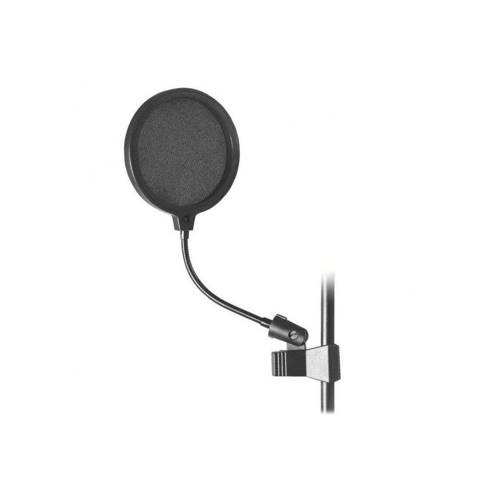Antipop Onstage ASVS6-B de 6 con pinza. Con aro de plástico de 6 y difusor de ondas en nylon negro, está soportado por un flexo y una pinza de ajuste a soporte de micro. Elimina los sonidos indeseados de las consonantes P y B al disponerlo entre tu y tu micro