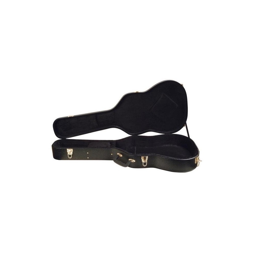 Estuche de guitarra eléctrica ON STAGE GCES7000. Negro. Este estuche de guitarra eléctrica está diseñado para alojar guitarras de semicaja, proporcionando protección y fácil transporte. Está fabricado con madera laminada de alta calidad y el interior está moldeado y proporciona un apoyo completo al mástil. Dispone un forro interior de suave felpa negra acolchada y un compartimiento para accesorios, perfecto para púas, cuerdas y cejillas. Los herrajes son color bronce, y el exterior se reviste con un resistente vinilo exterior color negro con ribetes reforzados en todos los bordes.
