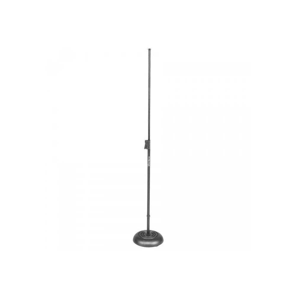 Soporte de micro On Stage MS7201QRB Quick-Release. Soporte recto con base redonda. Acabado en negro mate. Soporte estándar con base redonda de fundición de 3 kg de peso acabada en negro satinado, suficientemente resistente para el abuso de los bolos y suficientemente ligera para su transporte. Cuenta con un embrague de muelle para un rápido ajuste a dos manos y está acabado en negro mate. Altura ajustable de 86 a 157cm. Diámetro de base: 25cm. Peso total: 4,20kg.