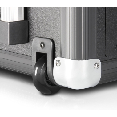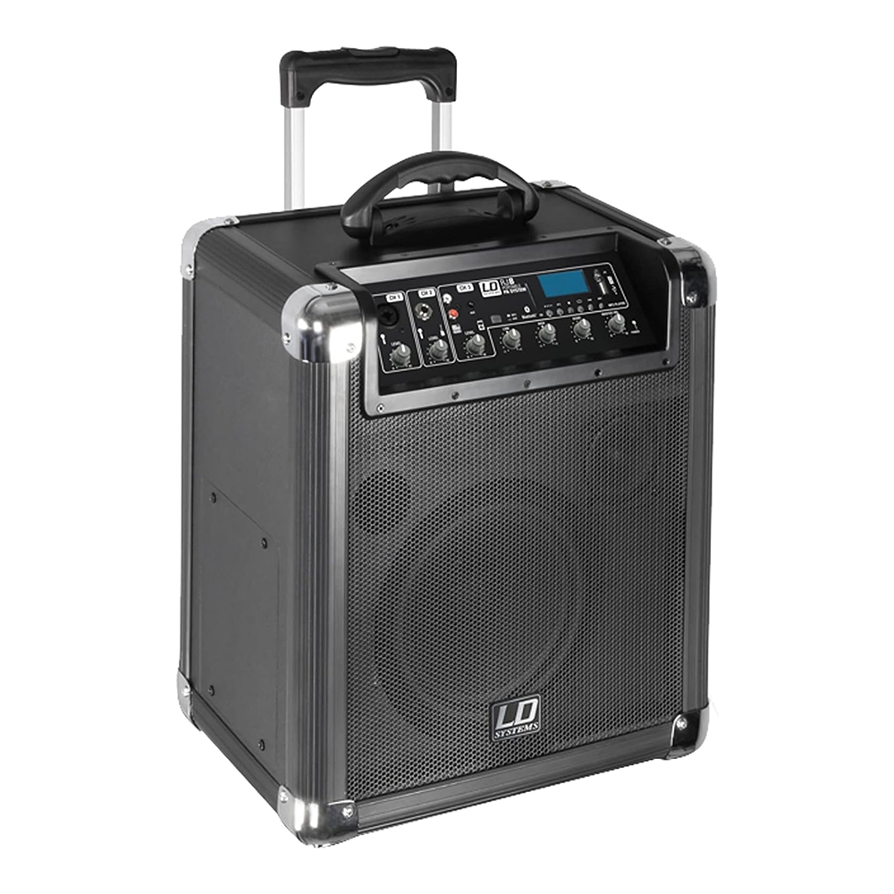 Con ruedas y mango extensible integrados para transportarlo cómodamente, el LDRJ8 ofrece una respuesta en frecuencia de 90 Hz a 18 kHz y una potencia de pico de 100 W. Su batería recargable proporciona hasta 20 horas de funcionamiento continuo.