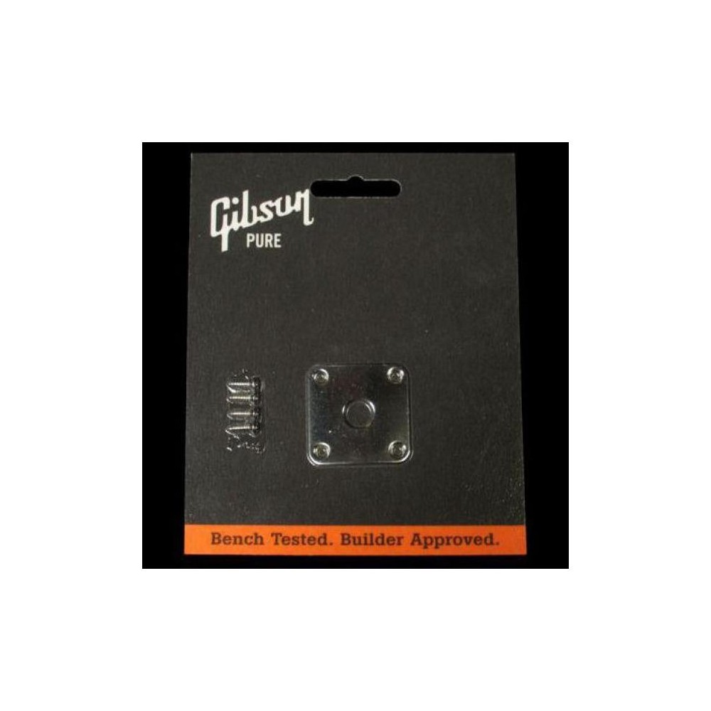 Placa Gibson PRJP-040 Nickel Jack Plate para Les Paul®, metálica niquelada. Para diámetro de jack de 3/8 (9.5mm). Cuadrada, de 1-11/32, con espaciado de agujeros para tornillos de 1 (25.4mm).