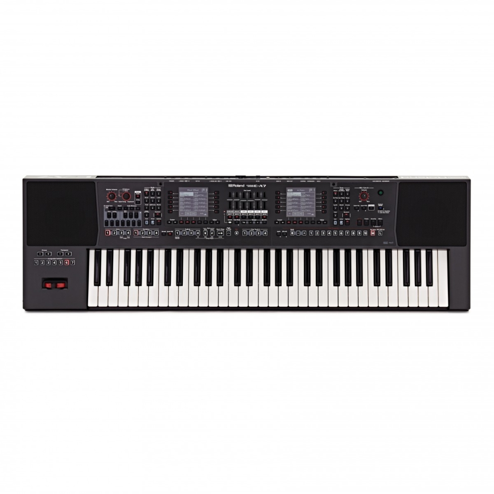 El Roland E-A7 Expandable Arranger Key board es un teclado moderno y versátil para los músicos que aprecian los sonidos profesionales y los estilos auténticos de todo el mundo. El funcionamiento del E-A7 es intuitivo, rápido y basado en el diseño de la interfaz con 2 pantallas. Los estilos de respaldo se muestran en la pantalla izquierda y los sonidos en la derecha. Se dispone de una amplia gama de botones para controlar ambas áreas.