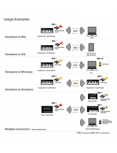 - Proporciona comunicación MIDI de baja latencia entre unidades WM y dispositivos MIDI Bluetooth macOS/iOS